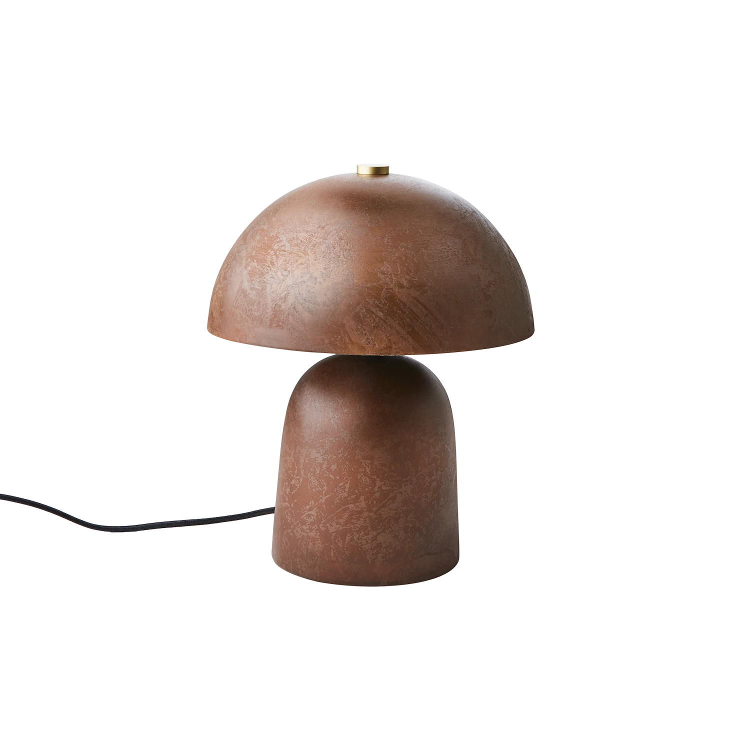 Table lamp Fungi rust brown. Stylish trendy lamp in rust matte metal with small gold detail on top. With a black textile cord with switch on. EU-plug. E27 socket. Height: 30cm. Width: 15cm in the bottom and 25cm on the top.