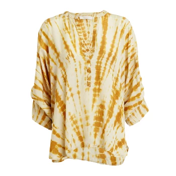 The light-weighted tie-dye blouse is crafted in Indonesia. With a loose fit featuring a V-neck and boxy sleeves the blouse is the perfect stand-out piece for a warm day, especially teamed with casual shorts and leather slippers.