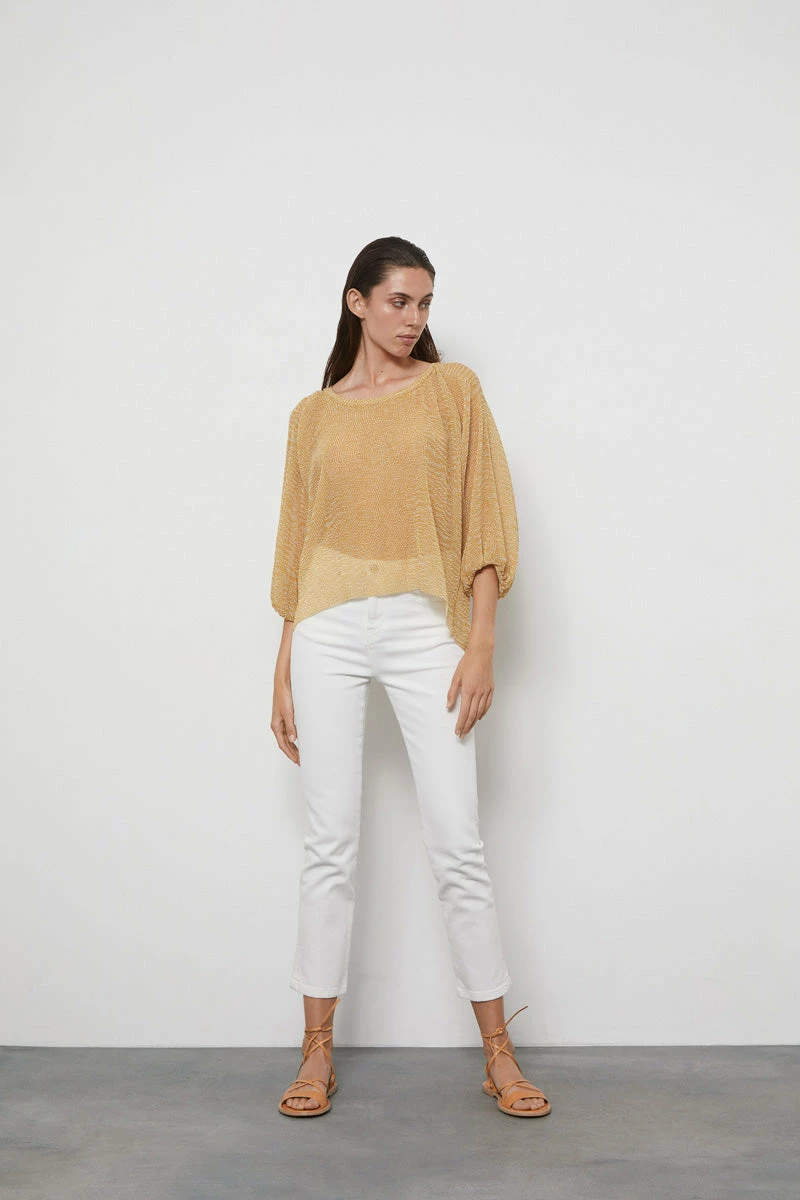 The Jeanice Blouse is crafted in Turkey from a characteristic dotted, transparent fabric. It works an oversized silhouette with cropped sleeves and a round neckline.