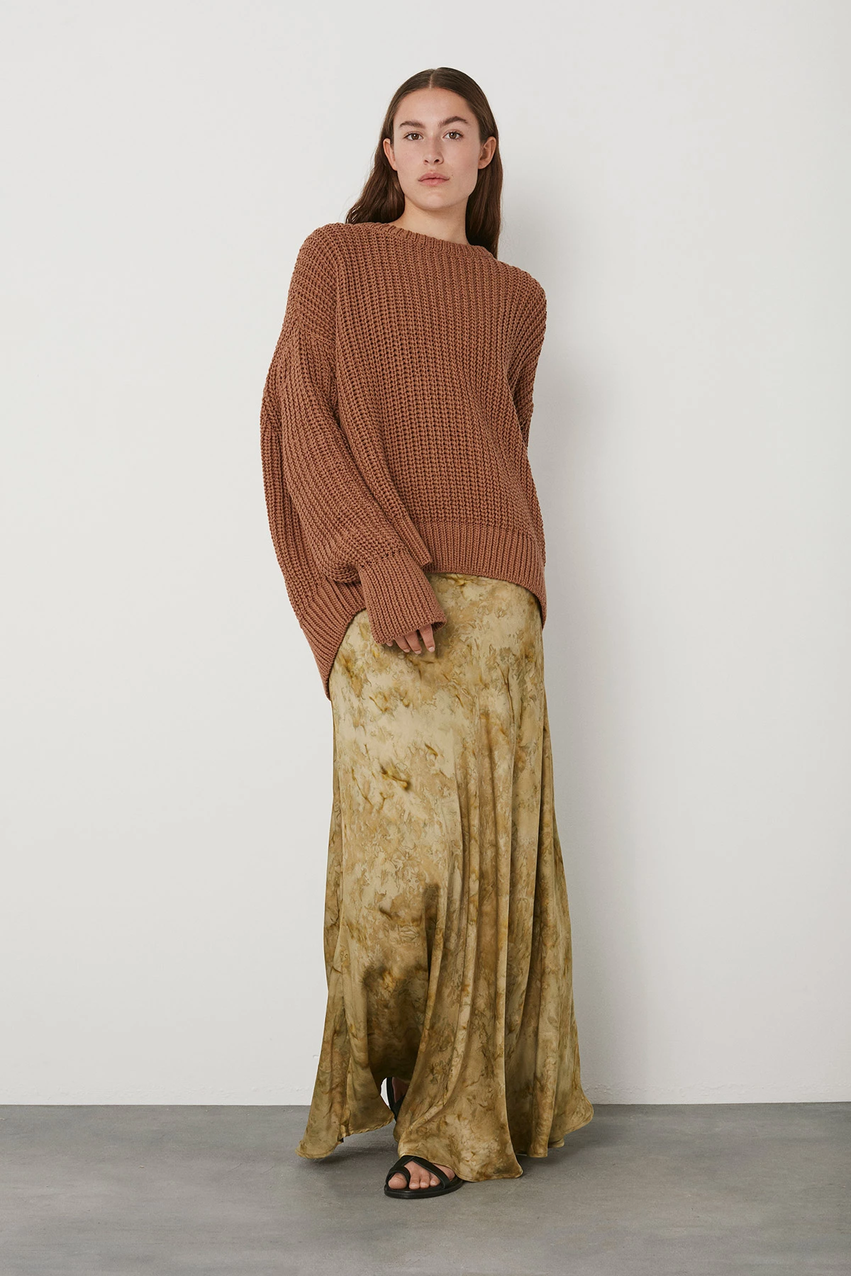 The skirt is crafted in Indonesia from a pleasant, light-weighted fabric. Cut in a flattering, bias silhouette with a fitted waist, a flared skirt and a zipper closure in the back, the skirt adds effortless elegance to any look.