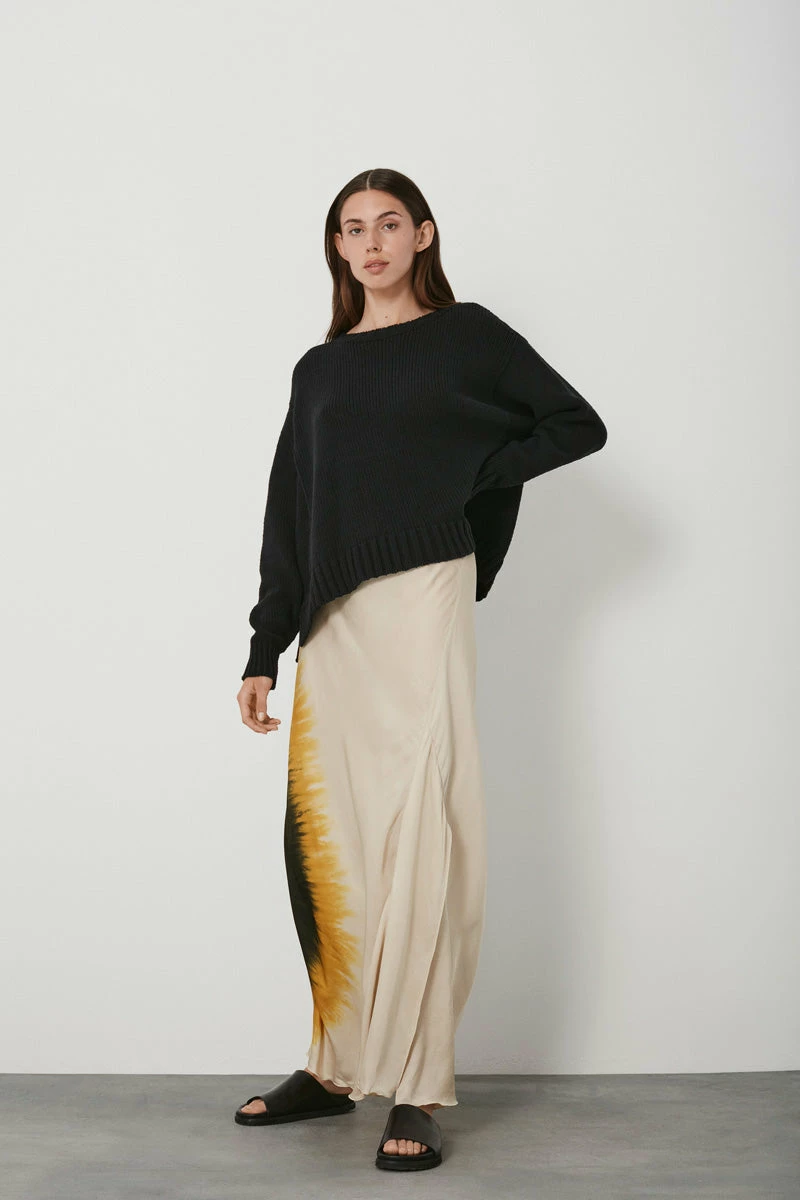 In a long, slinky silhouette, the hand-dyed Tamara Eclipse Skirt winds around the body highlighting the shape.